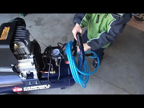 This compressor also includes a 25 foot PVC durable air hose. The air hose is 25 feet in length, 3/8 inch threads. Fittings: 1/4- inch NPT (M). Furthermore, the Campbell Hausfeld air compressor has a 2-in-1 brad nailer and air stapler. The 2-in-1 versatile magazine drives brad nails and crown staples.